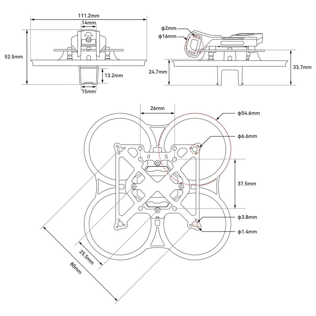 • Flight controller mounting holes: 25.5 × 25.5 mm, compatible with standard whoop type controllers;