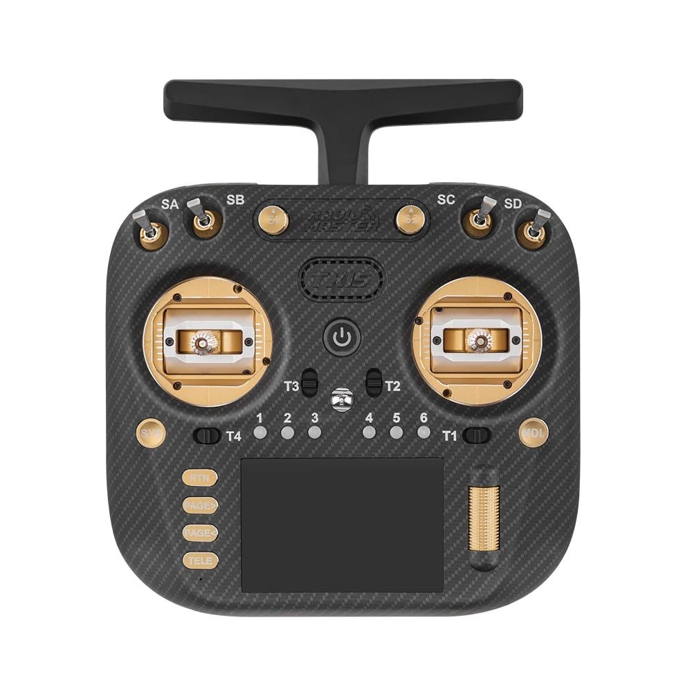 RadioMaster TX15 is an advanced open source remote control powered by the powerful STM32 H7 chip, ensuring smooth EdgeTX operation, fast model switching and scripting. The device supports 2.4 GHz and 900 MHz ExpressLRS (ELRS) communication, has a smart battery balancing system, a foldable antenna and an integrated gyroscope with TiltX/TiltY functions. The 3.5-inch IPS touch screen ensures a clear view even in sunlight. AG02 CNC aluminum levers, RGB lighting and carbon fiber imitation body give a professional, luxurious feel. TX15 MAX also features USB-C charging, SIM connectivity, fast memory access and replaceable switches.