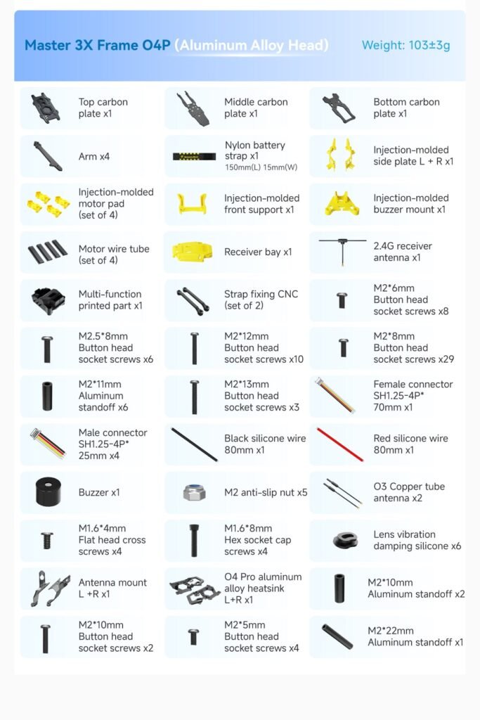 SpeedyBee Master 3X Frame O4P (Aluminum Alloy Head) is a durable and versatile FPV drone frame system made of strong 3K carbon fiber. The modular design allows you to easily adapt the frame to the flight system you use, such as the DJI O4 Pro Air Unit, or change the heads as needed.