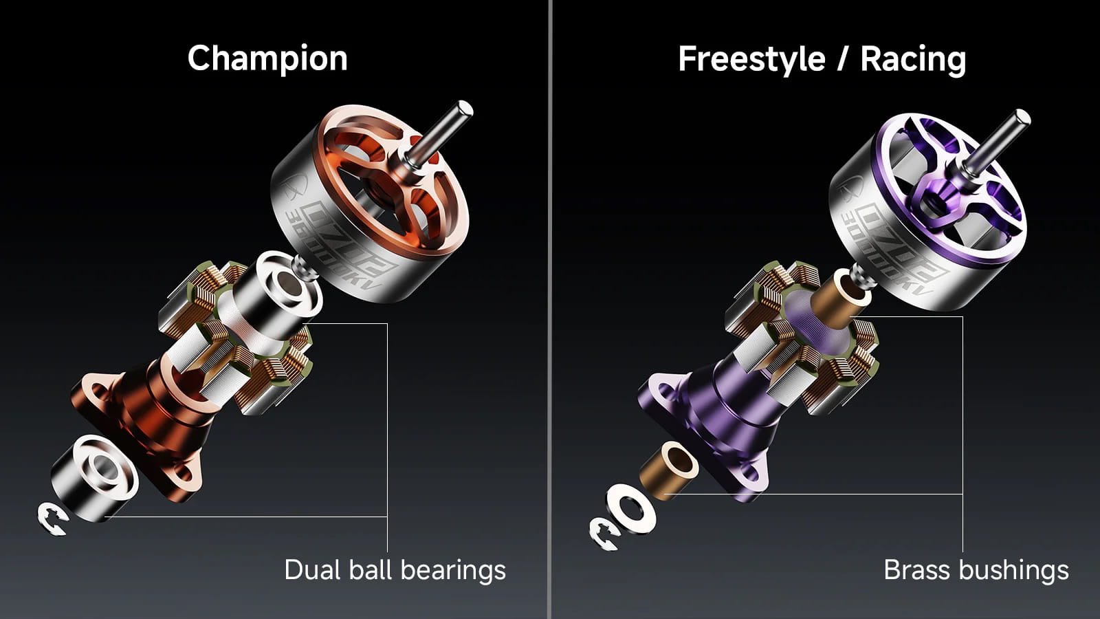Sukurti išskirtinai „Air65 II“ whoop modeliui, trys skirtingos versijos yra preciziškai suprojektuotos taip, kad atitiktų konkrečius našumo poreikius. Kiekviena jų turi skirtingus KV reitingus, magnetinės grandinės sprendimus ir apvijų technologijas, užtikrinančias optimalų galios perdavimą. Freestyle (25000KV) versija orientuota į sklandų valdymą ir didesnį sukimo momentą esant žemai traukai — idealiai tinka sklandžiam, kinematografiškam skrydžiui. Racing (30000KV) pasižymi aukštesniais sūkiais ir itin greita reakcija, suteikiančia manevringumo techninėse lenktynių trasose. Aukščiausios klasės Champion (36000KV) sujungia maksimalią galią ir momentinę droselio reakciją su patvariais dvigubais rutuliniais guoliais — sukurta dominuojančioms, profesionalaus lygio lenktynėms.