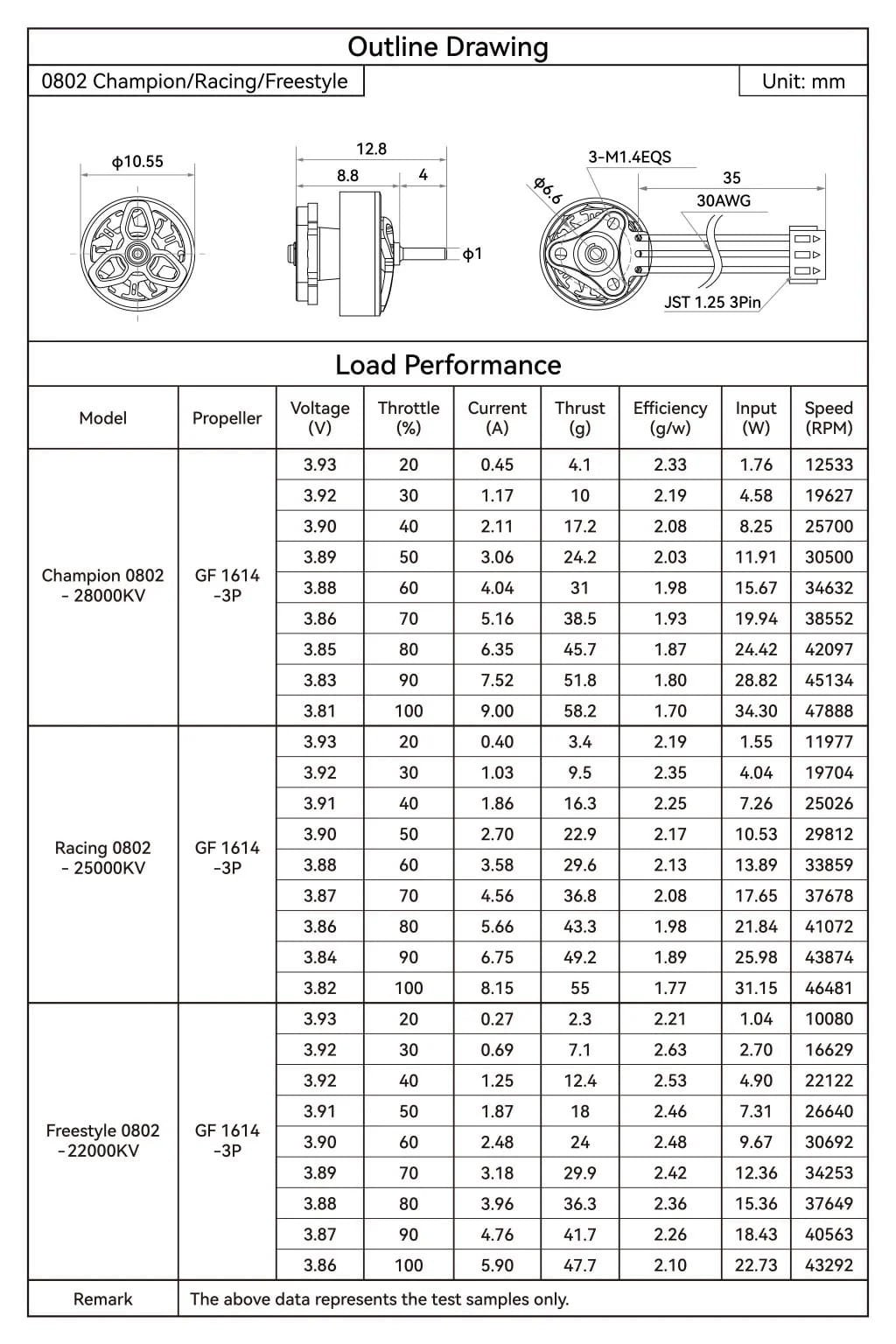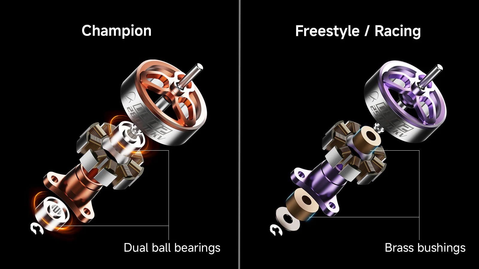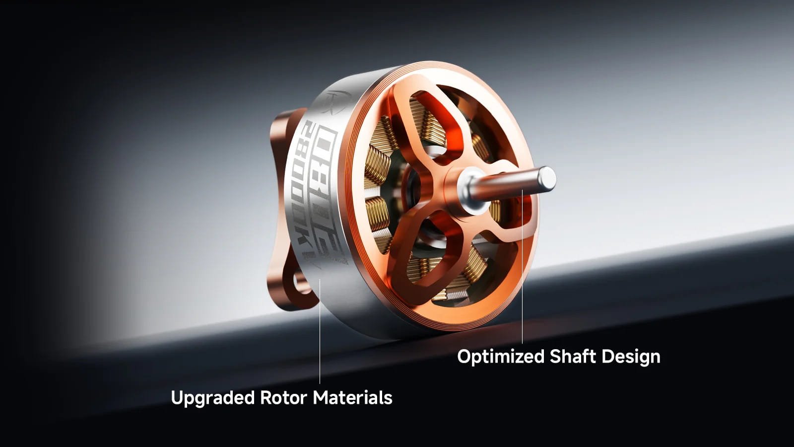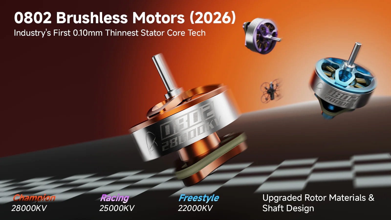 0802 bešepetėliniai varikliai siūlomi trijų versijų — Champion (28000KV), Racing (25000KV) ir Freestyle (22000KV)— kiekviena su skirtingai optimizuota magnetine sistema ir apvijomis, pritaikytomis konkrečiam skrydžio stiliui. Patobulintos konstrukcijos medžiagos ir sustiprinti komponentai padidina atsparumą smūgiams bei užtikrina ilgesnį tarnavimo laiką.