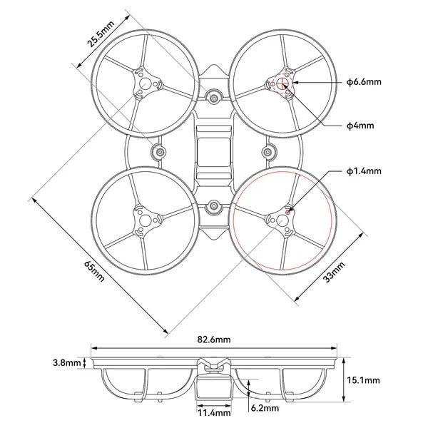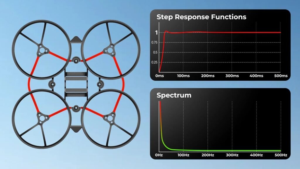 Po daugybės konstrukcijos patobulinimų galutinė jungiančių atramų forma efektyviai sumažina rėmo vibracijas. Kartu su „Feedforward“ derinimu tai užtikrina beveik tobulą PID atsaką su mažiau nei 12 ms delsos laiku – tai reiškia tikslų manevringumą ir itin sklandų freestyle skrydį.