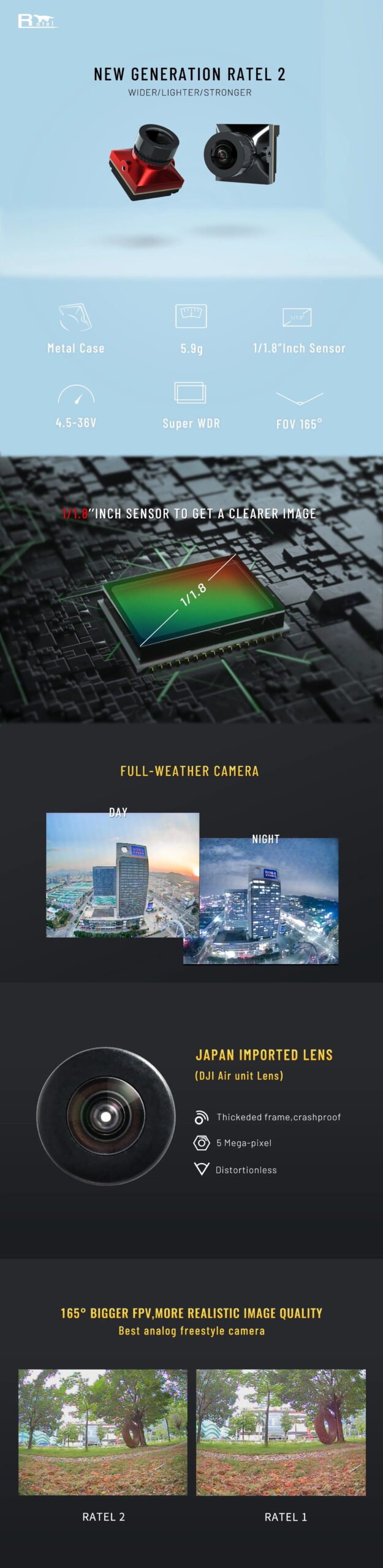 CaddxFPV Ratel 2 FPV kamera užtikrina aiškų 1200 TVL vaizdą ir platų 165° matymo kampą. Ji palaiko 4:3 ir 16:9 formatus.