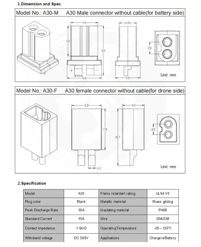 Flywoo A30-F 20AWG jungtis skirta aukštos srovės FPV dronams, užtikrinanti patikimą ir mažos varžos elektros perdavimą. Lyginant su PH2.0 jungtimis, A30 palaiko iki 15A nuolatinę srovę, todėl suteikia daugiau galios, geresnį efektyvumą ir ilgesnį skrydžio laiką.