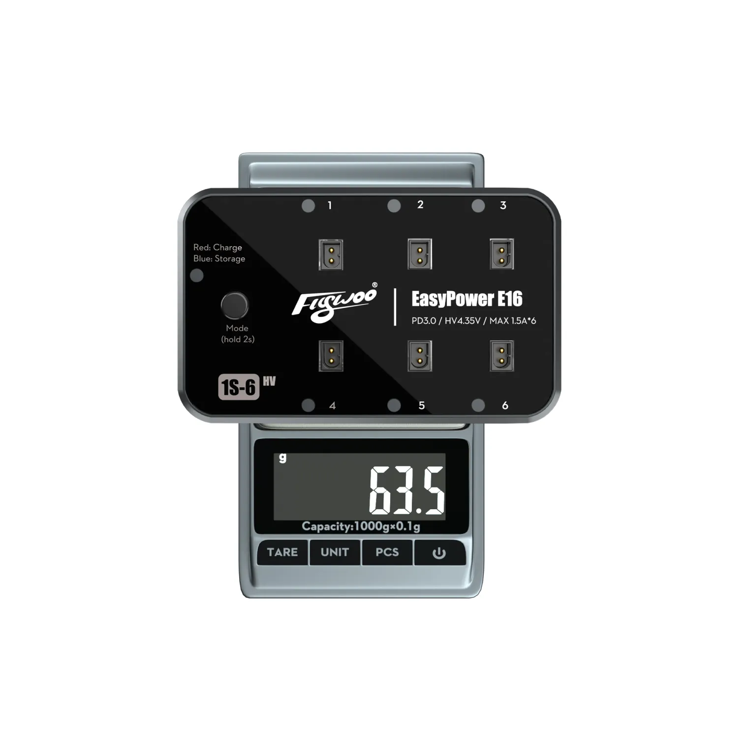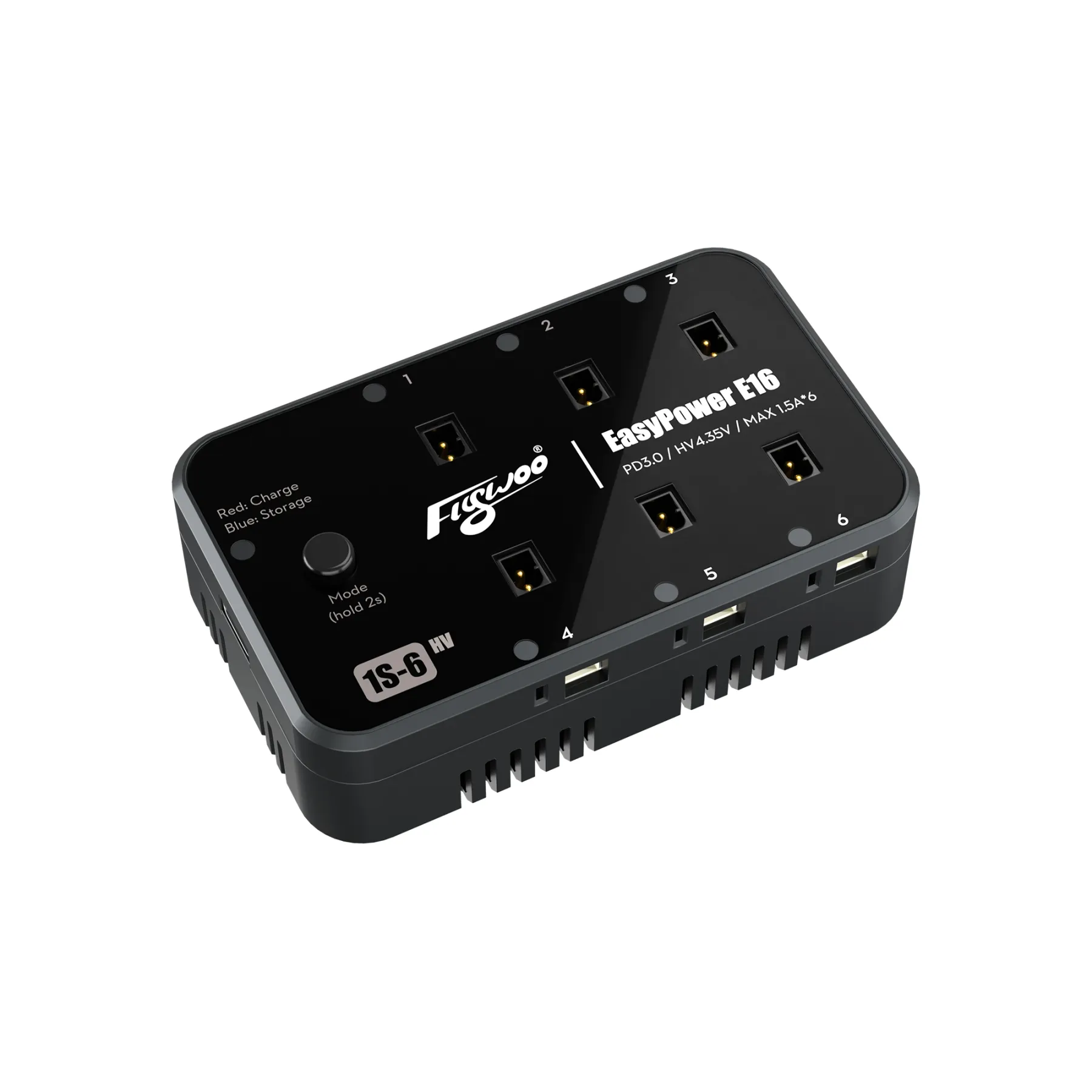 Tai išmanus 6 kanalų įkroviklis, leidžiantis vienu metu krauti iki 6 1S baterijų. Įrenginys palaiko greitą PD3.0 įkrovimą per USB-C jungtį ir pasižymi „plug-and-play“ veikimu – baterijos pradedamos krauti automatiškai, be sudėtingų nustatymų.