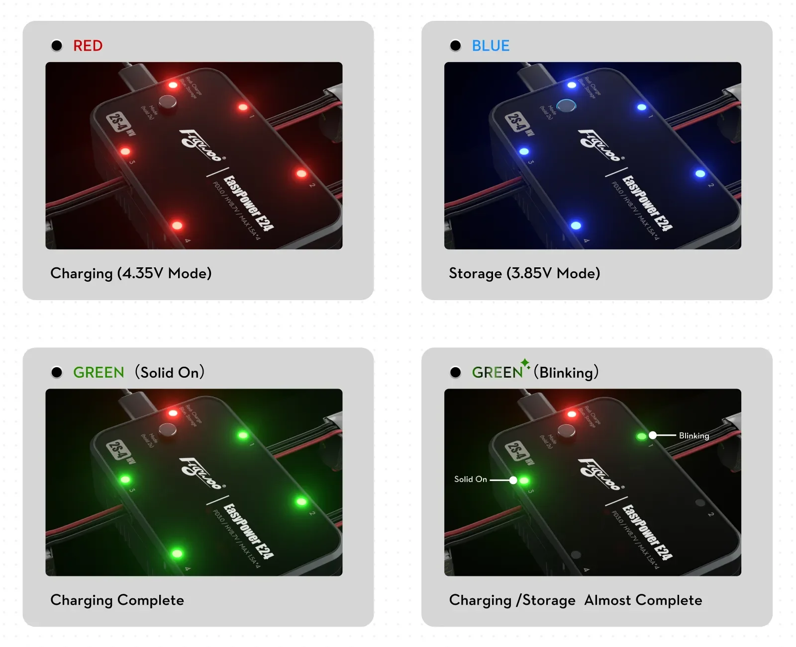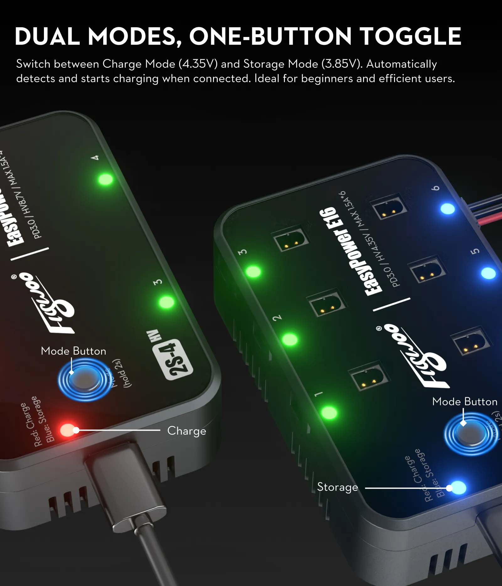 Lengvai perjunkite tarp įkrovimo (4.35V) ir saugojimo (3.85V) režimų. Prijungus bateriją, įrenginys ją automatiškai atpažįsta ir pradeda krauti.