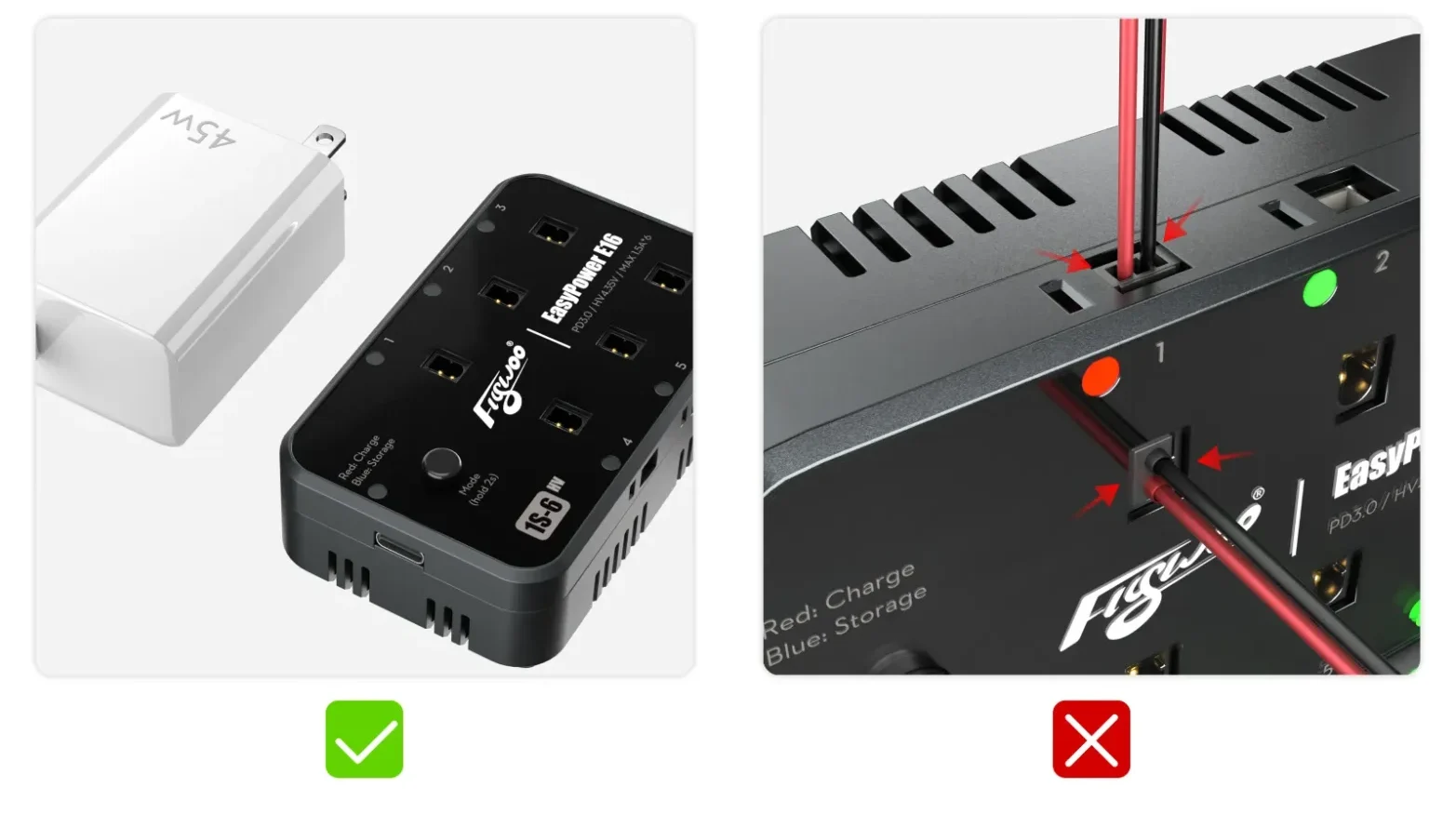 *Svarbu: Būtina naudoti GaN 45W ar galingesnį įkroviklį, kitaip įrenginys gali veikti netinkamai. Viename kanale negalima vienu metu jungti A30 (BT2.0) ir PH2.0 baterijų – tai gali sugadinti įkroviklį.
