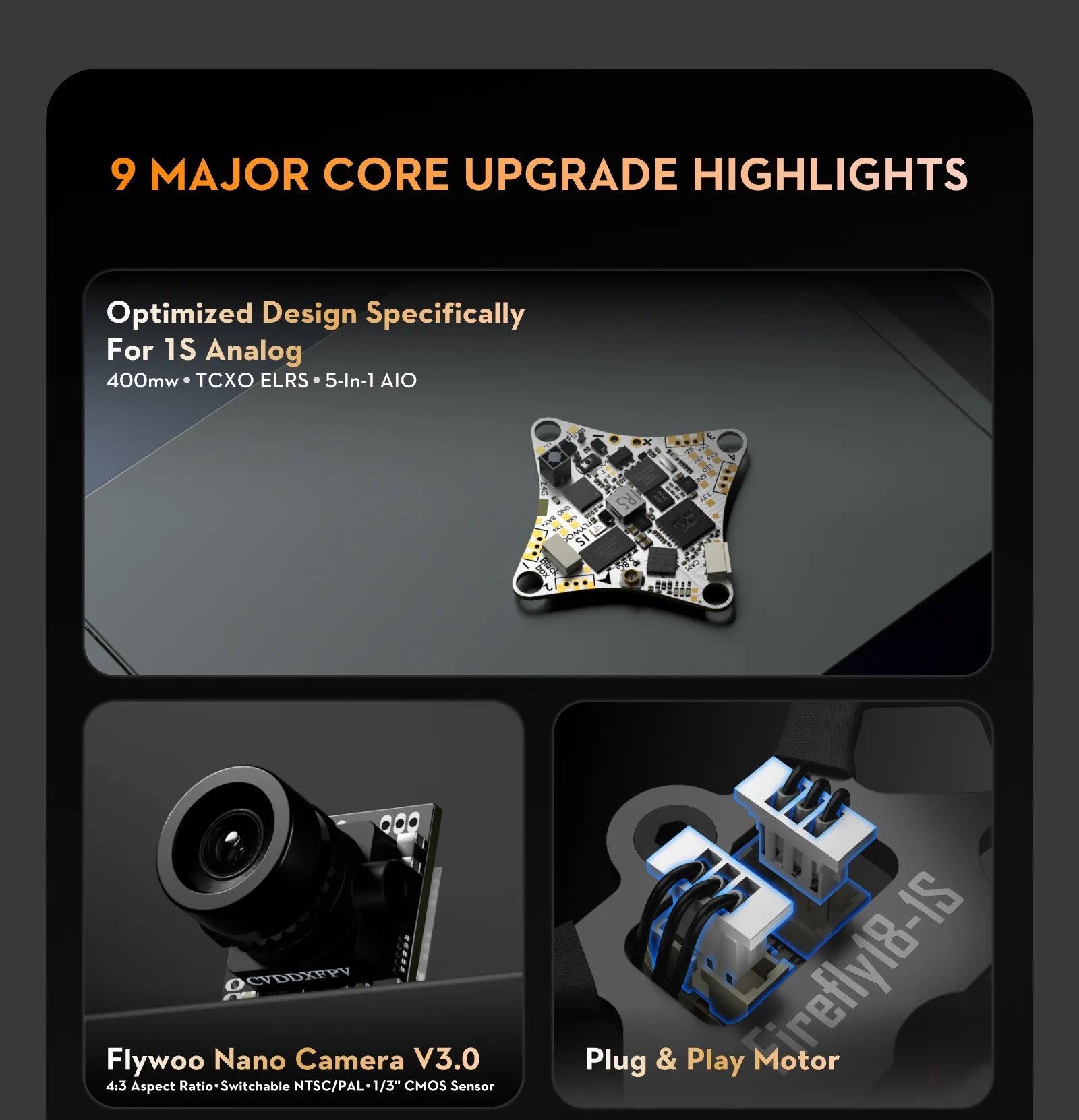 Flywoo Firefly18 1S Nano Baby V3 Analog Tiny Drone yra ultra-lengvas ir itin kompaktiškas 1S klasės FPV dronas, sukurtas smagioms ir tikslinėms skrydžių sesijoms tiek patalpose, tiek lauke. Jis puikiai tinka pradedantiesiems FPV pilotams, taip pat tiems, kas nori nebrangaus whoop tipo drono su geru valdymu ir daug galios.