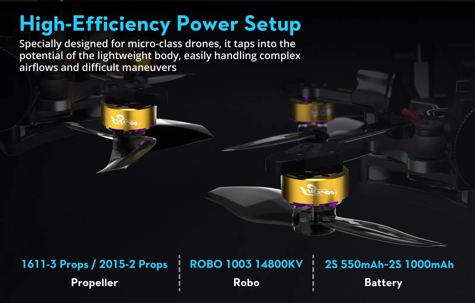 • Galinga trauka: Flybee 16: ROBO 1003 varikliai ir 1611-3 40 mm propeleriai efektyviai galiai;