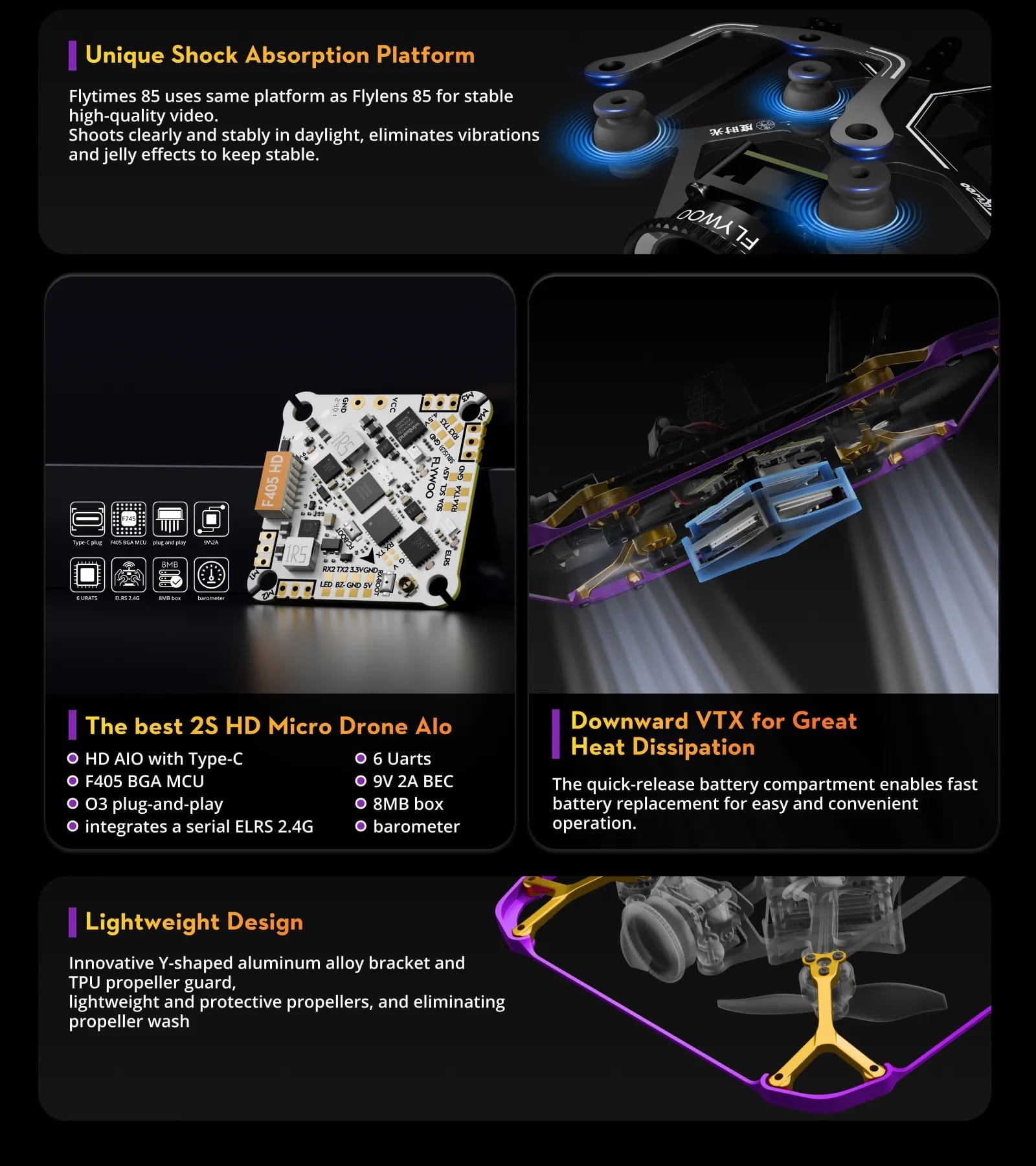 • Unikali vibracijų slopinimo platforma – Flytimes 85 naudoja tą pačią amortizacijos platformą kaip ir Flylens 85, kuri užtikrina stabilų, ryškų vaizdą.