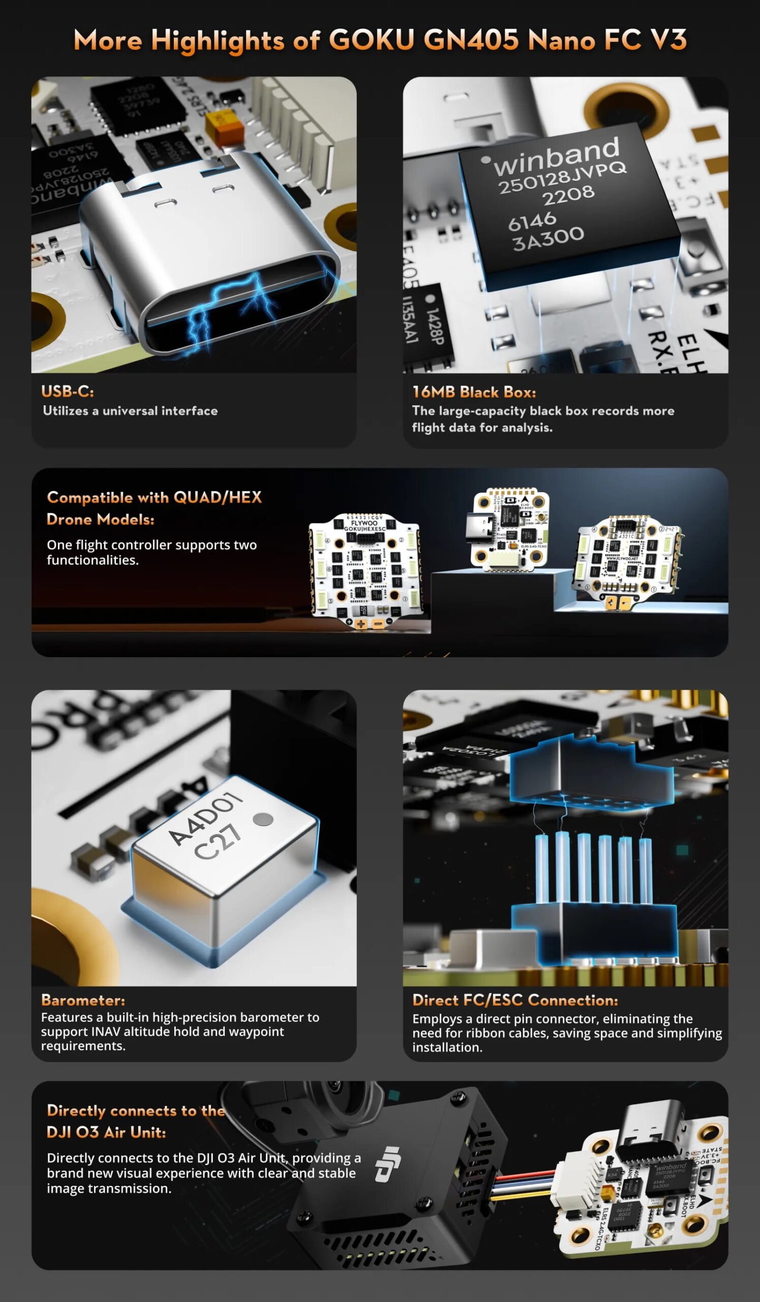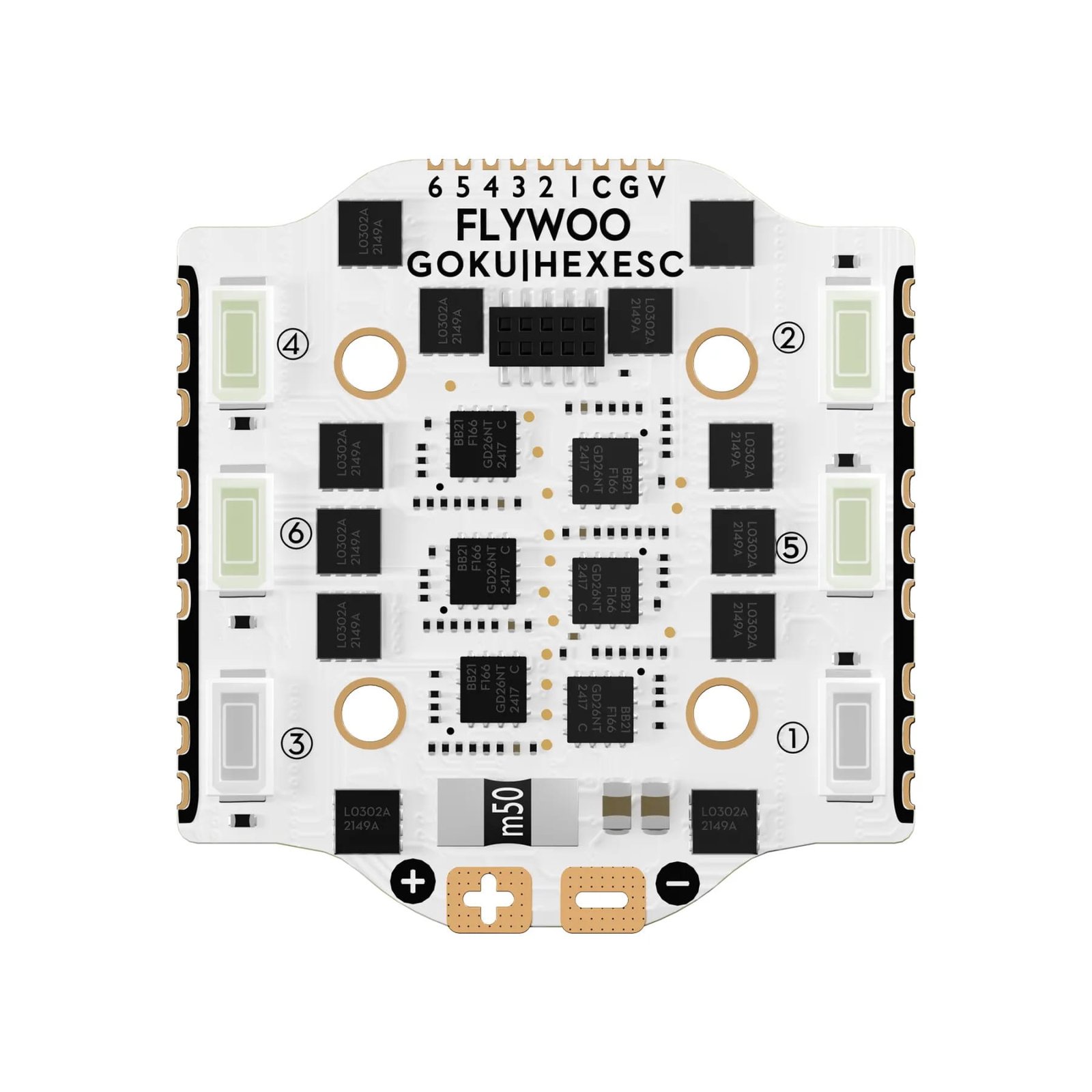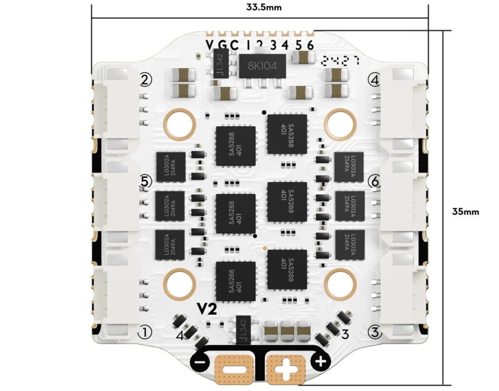 Flywoo GOKU HEX BS 20A ESC V3 yra kompaktiškas elektroninis greičio valdiklis, skirtas mikro ir mini FPV dronams. Ši versija yra sukurta HEX (6 variklių) konfigūracijai, todėl idealiai tinka mažo dydžio dronams. Plokštė palaiko modernius protokolus, tokius kaip DShot150, DShot300 ir DShot600, užtikrinančius greitą ir stabilų ryšį tarp FC ir variklių. FC veikia su 2–4S LiPo baterijomis ir gali tiekti iki 20A nuolatinę srovę.