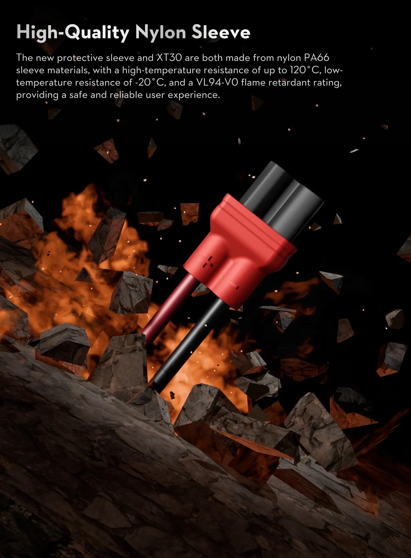 Naujasis apsauginis korpusas ir XT30 jungtis pagaminti iš PA66 nailono. Ši medžiaga pasižymi dideliu atsparumu temperatūrai – gali atlaikyti iki 120 °C karštį ir iki –20 °C šaltį. Be to, korpusas turi UL94-V0 atsparumo liepsnai sertifikatą, todėl užtikrina saugų ir patikimą naudojimą.