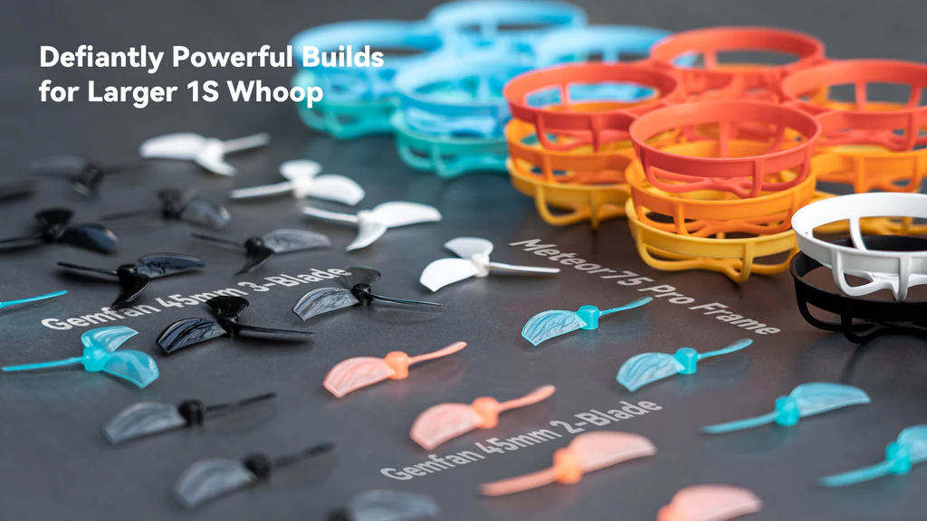 Didesnis 1S dronų komplektas – Meteor75 Pro rėmas su 45 mm 3 menčių propeleriais užtikrina tikslų, manevringą ir stabilų skrydį. Suderinamas su 1S Meteor serijos komponentais, todėl lengvai modifikuojamas ir atnaujinamas. Dėl 45 mm propelerių tai vienas didžiausių 1S whoop tipo dronų, puikiai tinkantis naudoti su HD VTX patalpose.