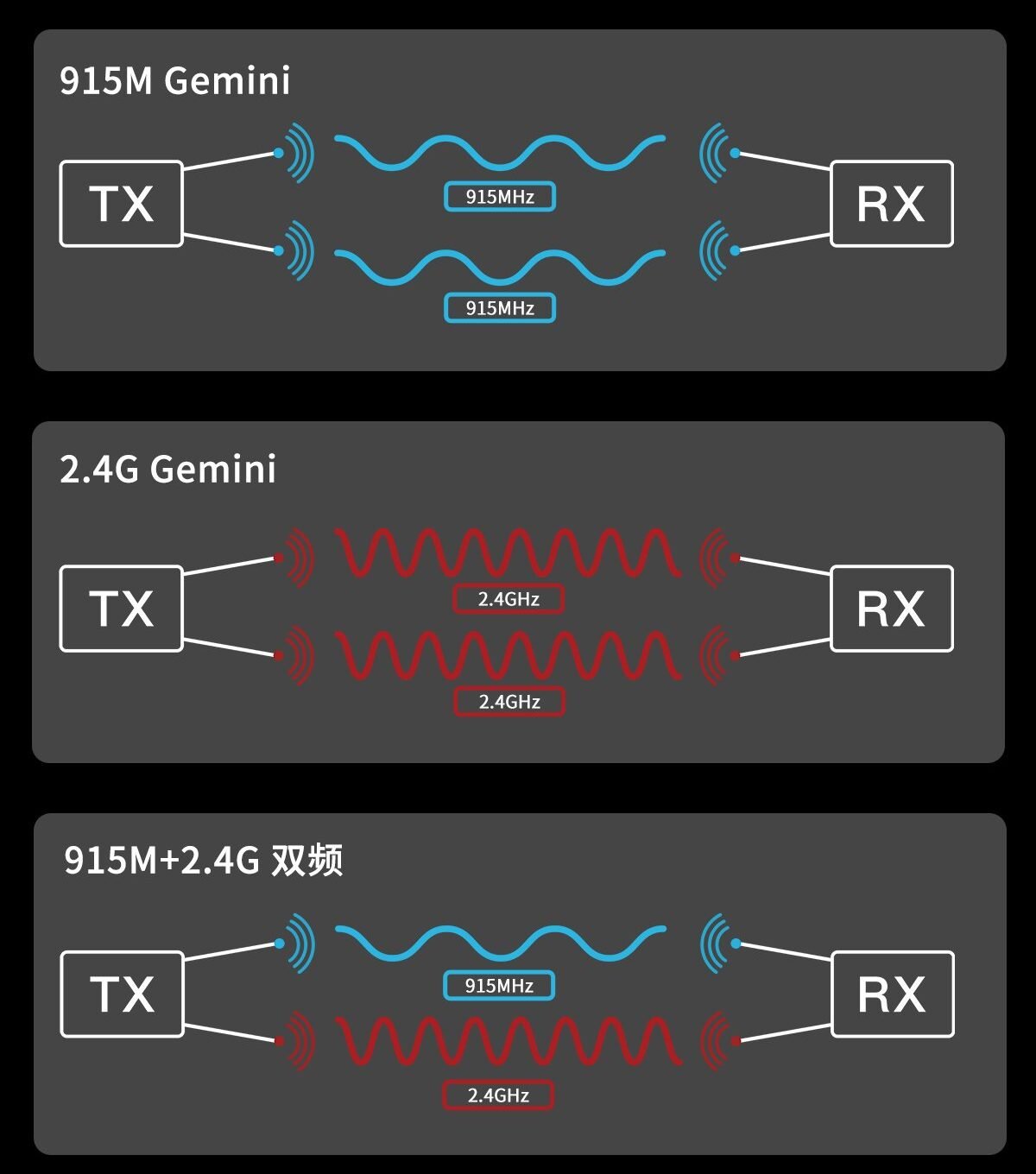Veikia 915M Gemini, 2.4G Gemini ir dviejų dažnių režimais. Dvigubo dažnio režimu gali atskirai komunikuoti 915 MHz ir 2.4 GHz juostose, užtikrindamas geresnį atsparumą trikdžiams.
