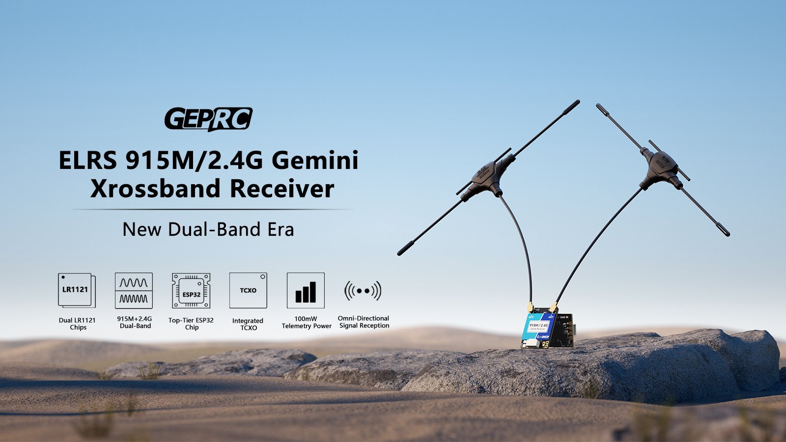 GEPRC ELRS 915M/2.4G Gemini Xrossband imtuvas – tai nauja dviejų dažnių sistema, sukurta remiantis atvirojo kodo projektu ExpressLRS. Jis sukurtas pagal trečios kartos „Semtech“ LR1121 RF lustą ir palaiko 150–960 MHz (sub-GHz) bei 2.4 GHz dažnių juostas, leidžiančias tuo pačiu metu perduoti du dažnius. Dviejų dažnių režime užtikrinamas padidintas atsparumas trukdžiams ir sistemos stabilumas. TCXO užtikrina patikimą veikimą esant įvairioms temperatūroms, o telemetrijos siuntimo galia siekia iki 100 mW. Integruota Wi-Fi antena leidžia lengvai atnaujinti programinę įrangą, o SH1.0 jungtis supaprastina montavimą.