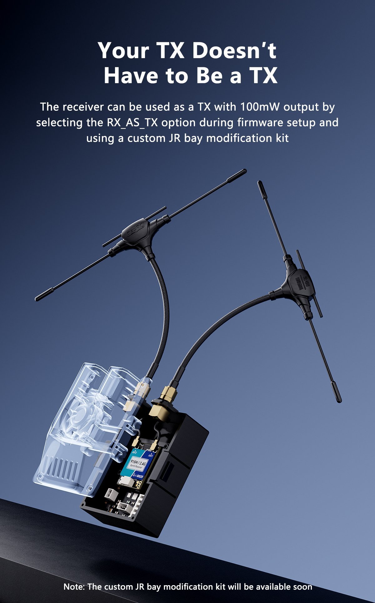 Imtuvą galima naudoti kaip siųstuvą su 100 mW išėjimo galia, jei programinės įrangos nustatymuose pasirenkama parinktis RX_AS_TX