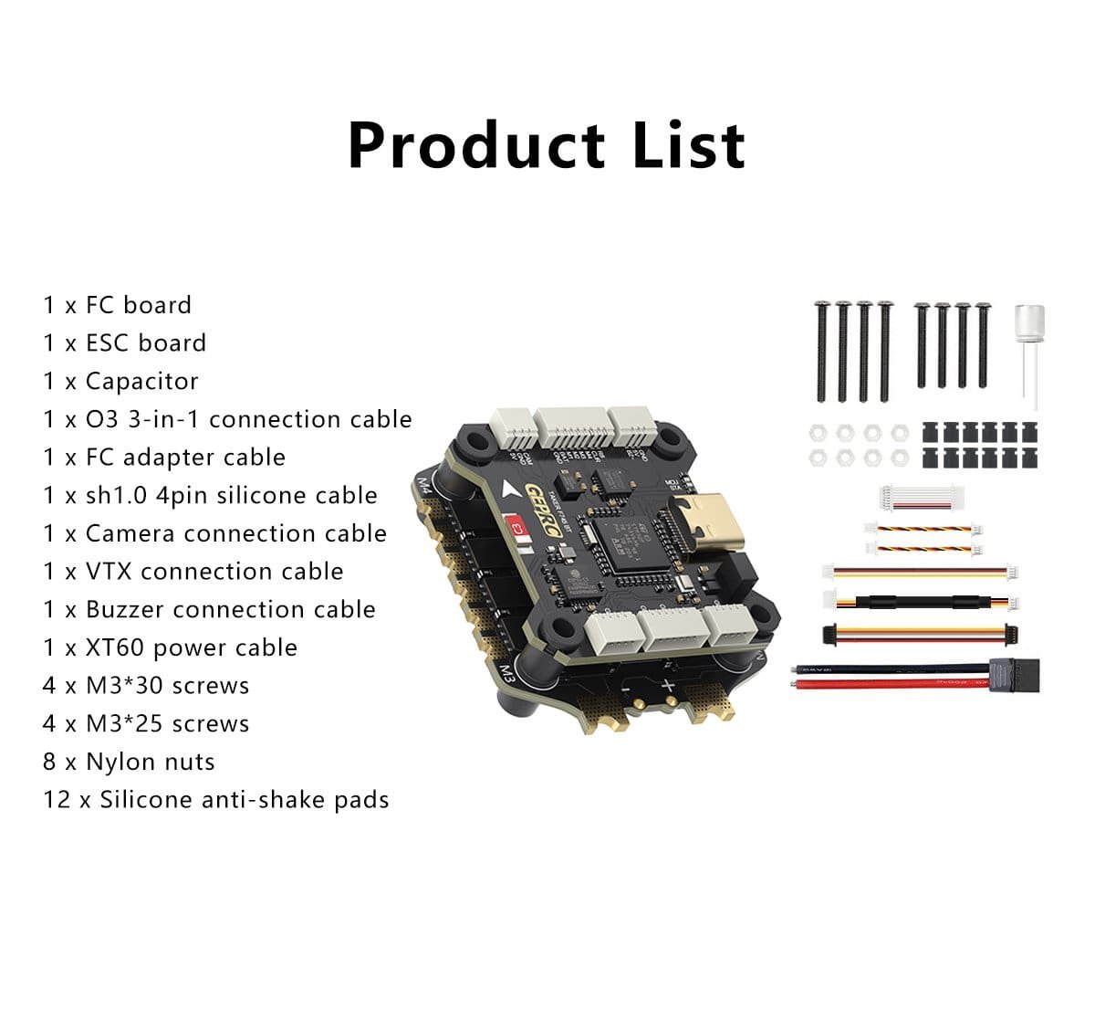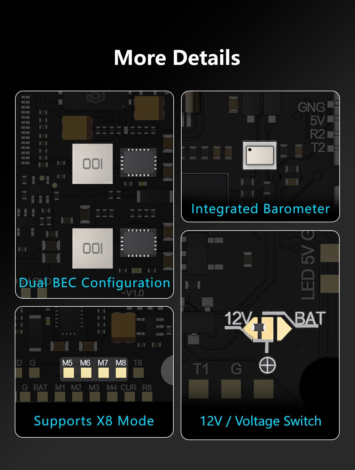 Palaikomi Betaflight, INAV ir Ardupilot – didelis suderinamumas. Du nepriklausomi BEC (5V@3A ir 12V@2.5A) užtikrina stabilų maitinimą. Be to, yra 7 UART prievadai, integruotas barometras ir plug-and-play konstrukcija. Su TAKER H60_BLS 4-in-1 ESC komplektas suteikia itin sklandų ir patikimą skrydį.
