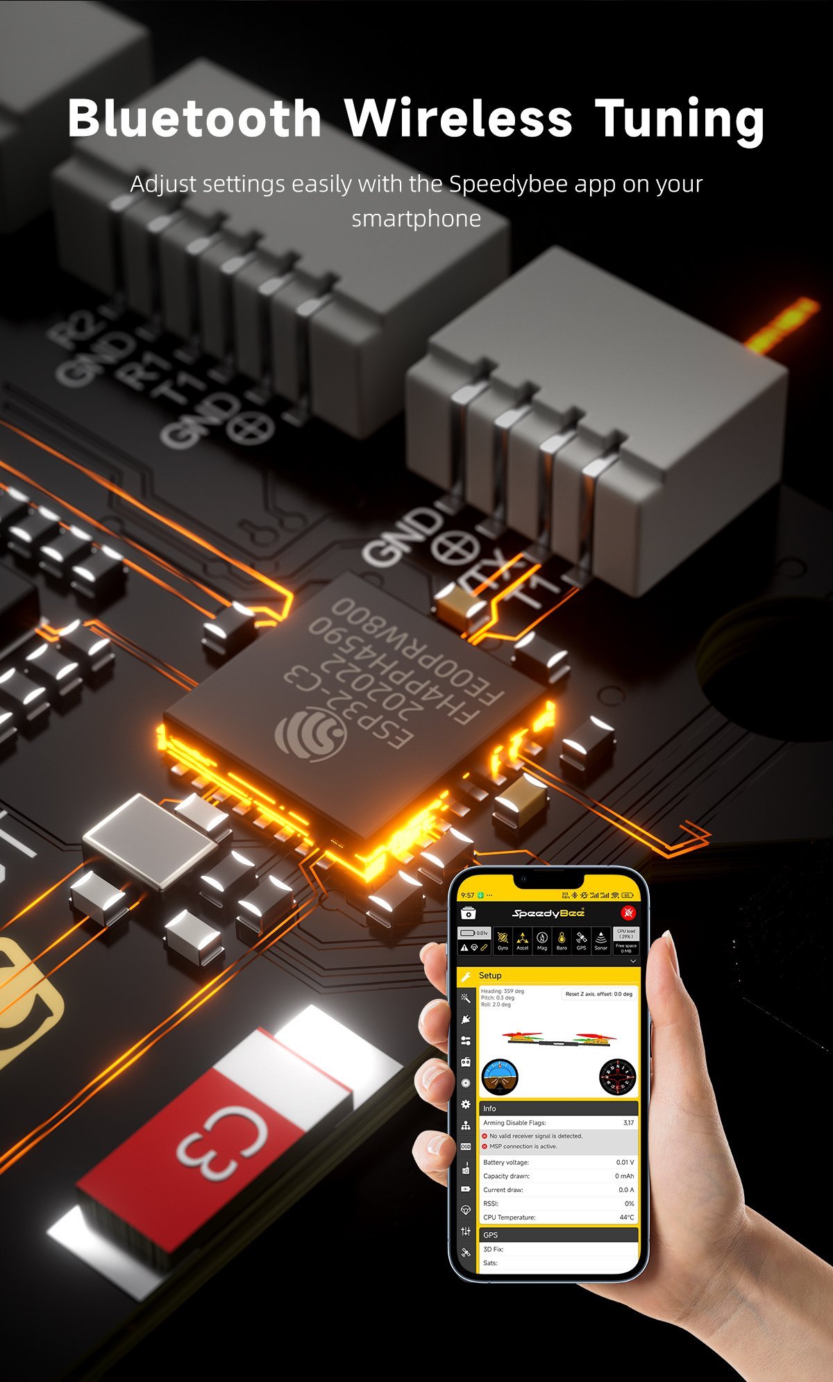 Aukštos klasės GEPRC TAKER H743 BT 8Bit 80A drono „stack“ sistema su galingu H743 valdikliu, dvigubu giroskopu, Bluetooth reguliavimu ir 80A 4in1 ESC, skirta sklandžiam bei našiam FPV skrydžiui.