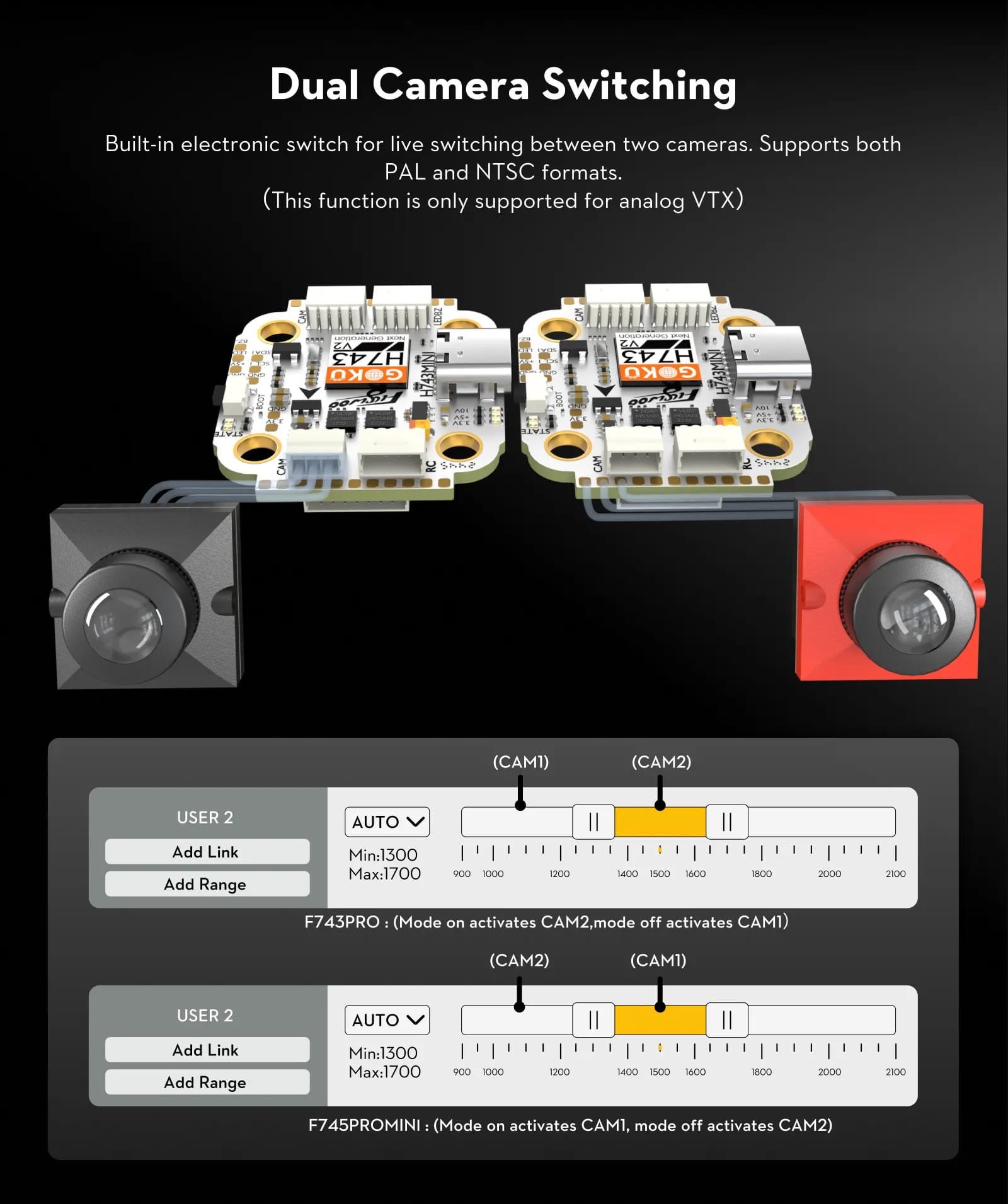 • F743PRO: Įjungtas režimas aktyvina CAM2, išjungtas – CAM1;