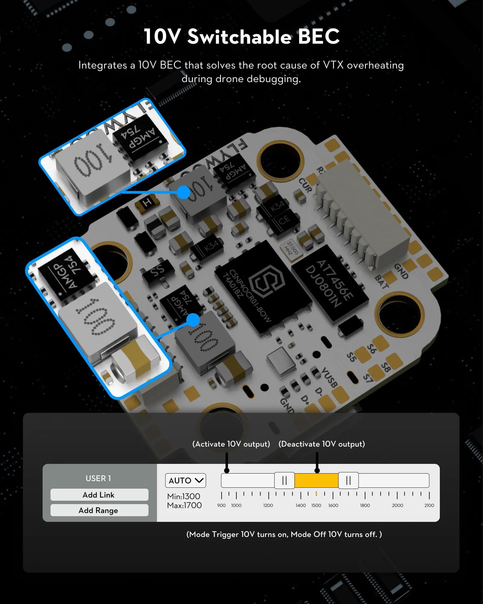 Integruotas 10 V BEC išsprendžia VTX perkaitimo problemą drono derinimo metu.