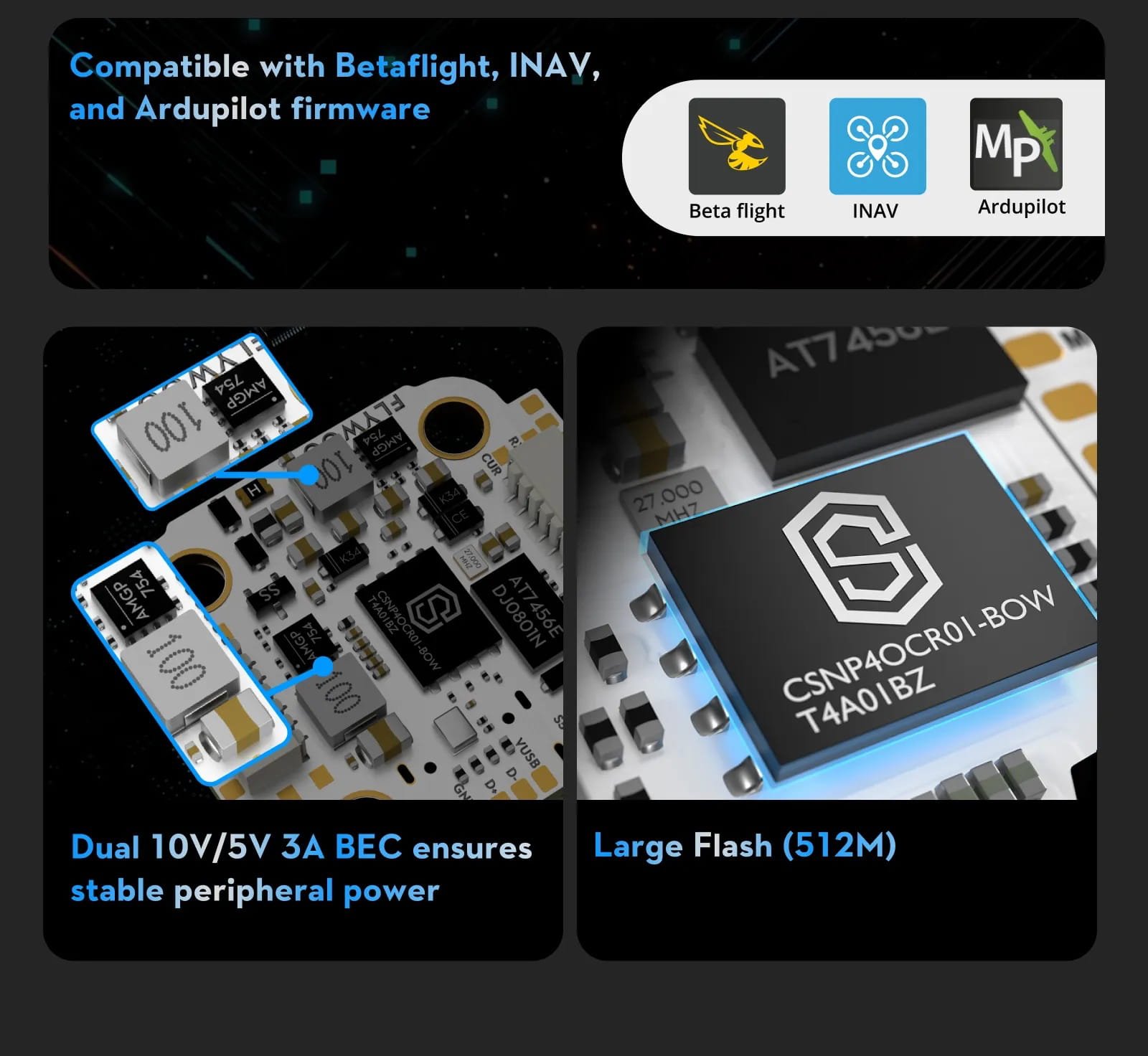 Suderinamas su Betaflight, INAV ir ArduPilot programine įranga, dvigubas 10 V / 5 V 3 A BEC užtikrina stabilų įrenginių maitinimą. Didelė „Flash“ atmintis (512 MB).