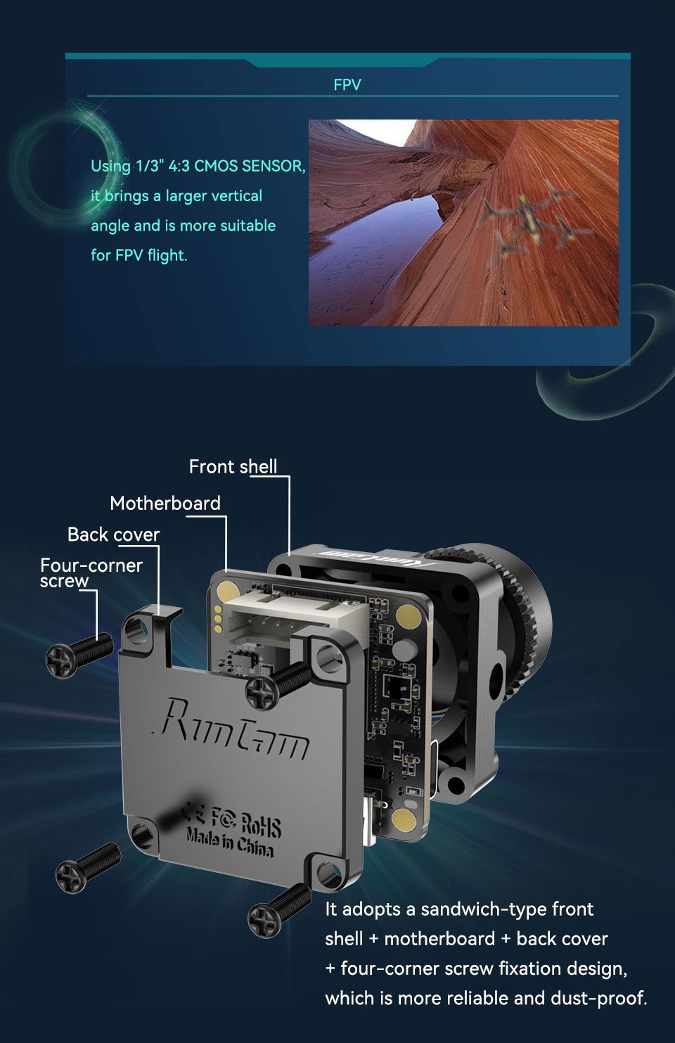 RunCam Robin 3 naudoja 1/3″ 4:3 CMOS jutiklį, kuris suteikia didesnį vertikalų matymo kampą ir leidžia geriau matyti trasą FPV skrydžių metu. Tvirta „sumuštinio“ tipo konstrukcija – priekinė dalis, pagrindinė plokštė ir galinis dangtelis, sujungti keturiais kampiniais varžtais – užtikrina didesnį patikimumą, atsparumą dulkėms ir ilgesnį kameros tarnavimo laiką.