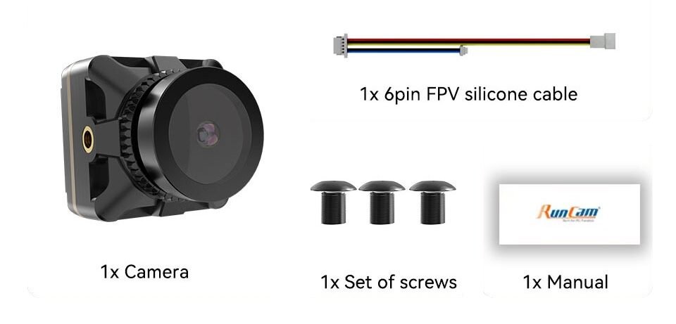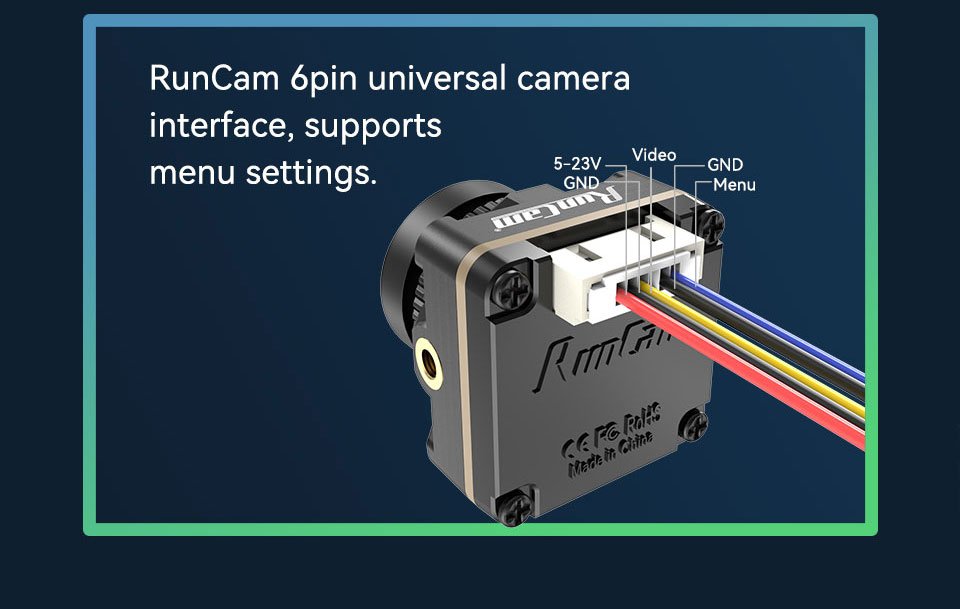 RunCam 6-pin universali jungtis palaiko meniu nustatymus ir leidžia lengvai konfigūruoti kamerą per kabelį. Palaikomas maitinimas 5–23 V, vaizdo išėjimas ir meniu valdymas vienu laidu.
