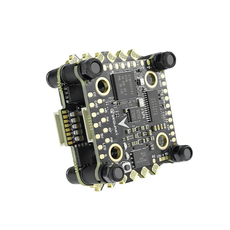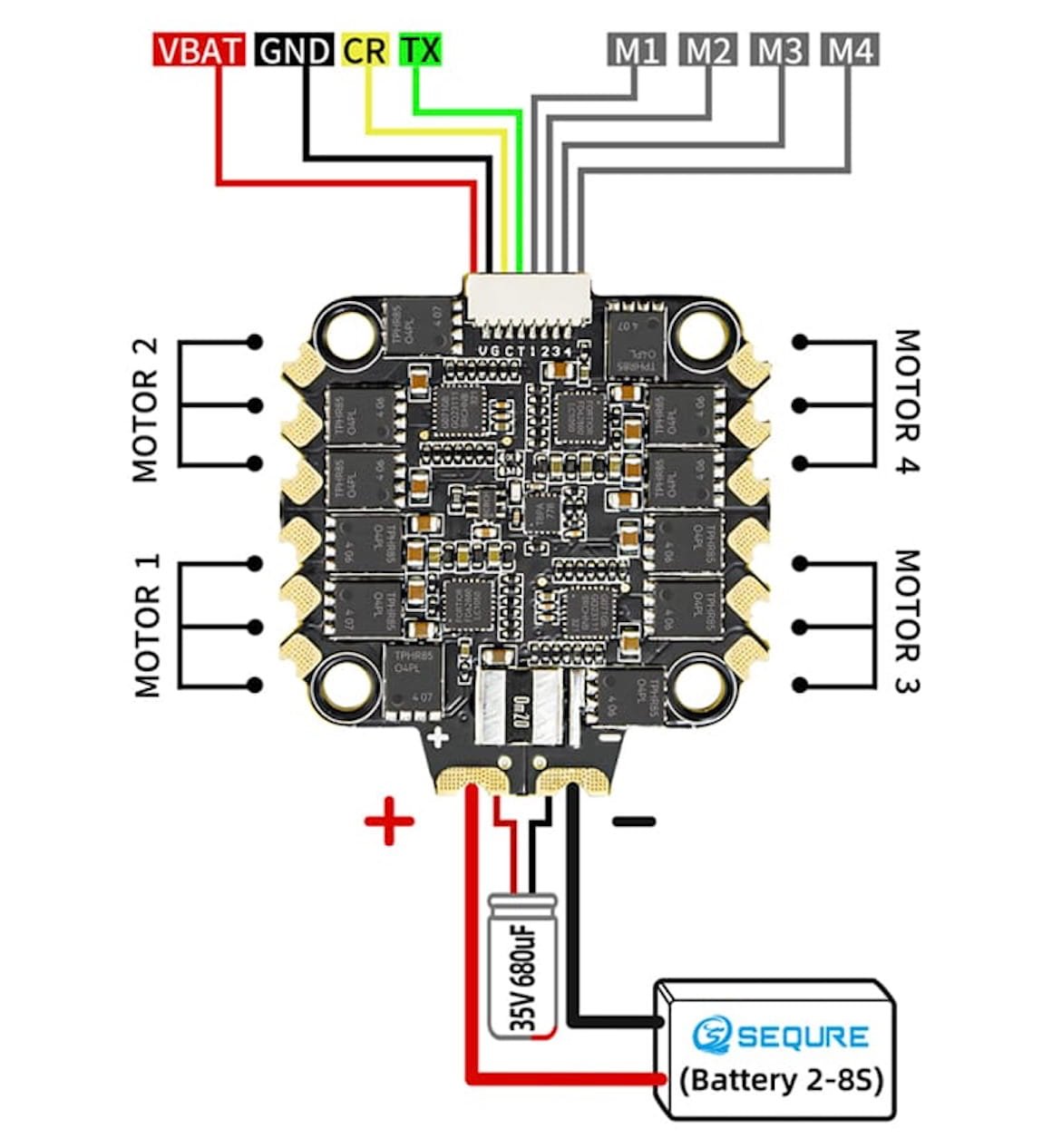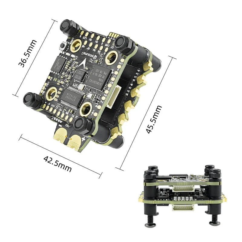 • STM32G071 aukšto našumo procesorius, palaiko AM32 firmware, 2–8S plati įtampos įvestis, 70 A nuolatinė srovė vienam kanalui, pikinė srovė iki 150 A;
