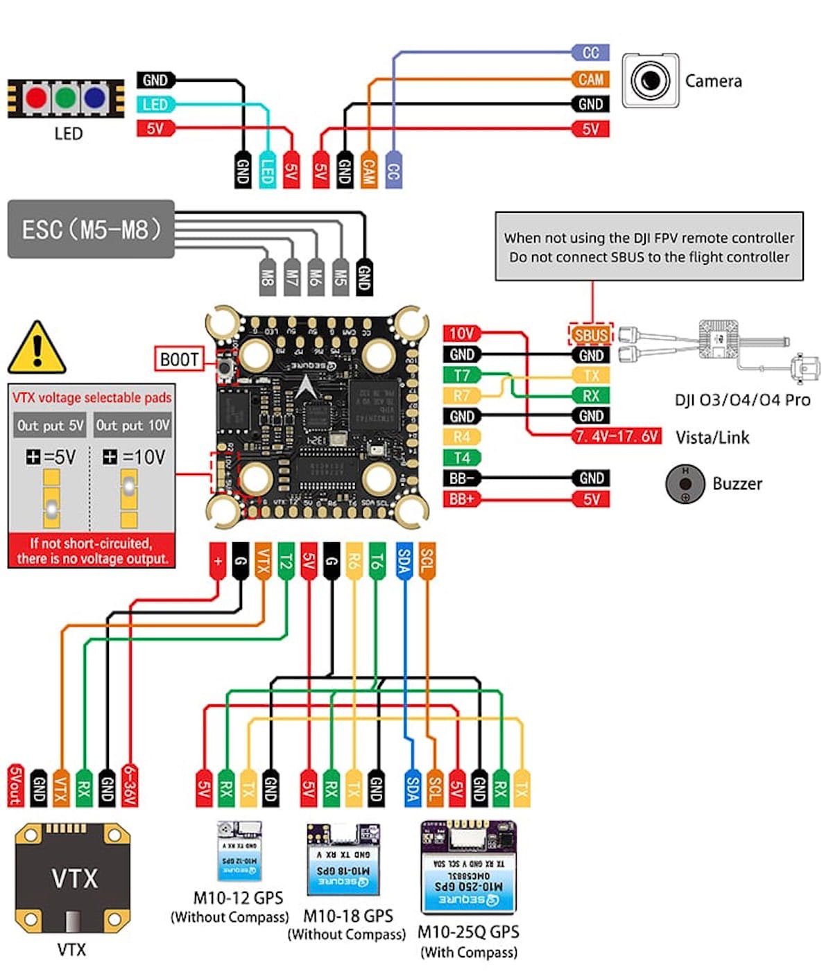 • Įrengtas kištukine jungtimi ir dviem BEC išėjimais. FC tiekia nepriklausomą 10 V įtampą, leidžiančią DJI O3 / O4 / O4 Pro ir analoginį VTX prijungti tiesiogiai;