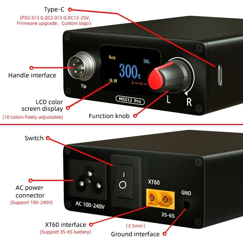 • Tinka T12 lituoklio antgaliams, palaiko ℃/℉ perjungimą, maksimali temperatūra – 450℃;
