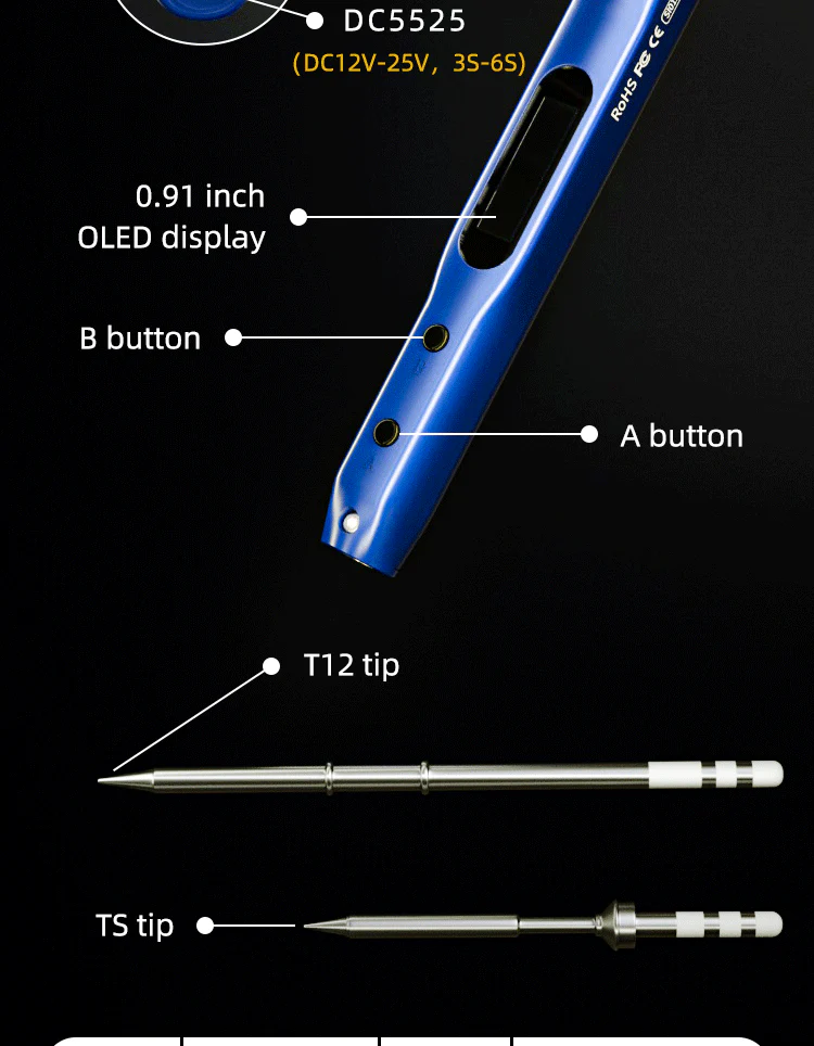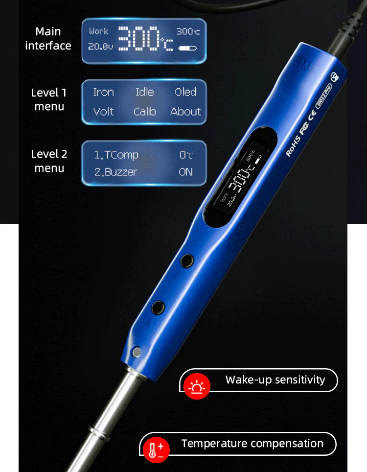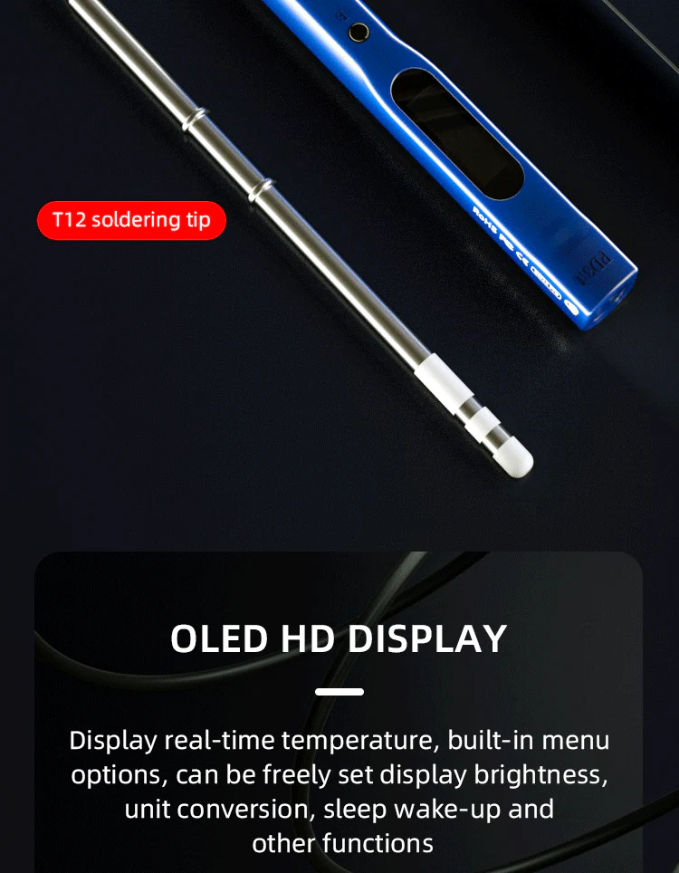 • 0,91 colio OLED ekranas su reguliuojamu ryškumu leidžia patogiai stebėti darbo parametrus.