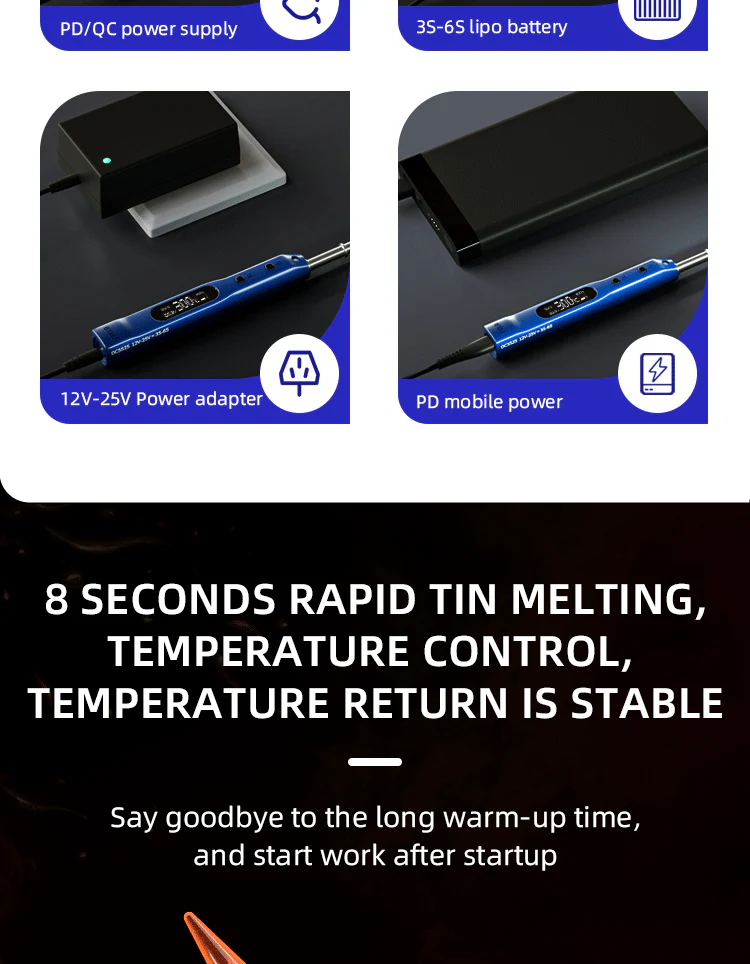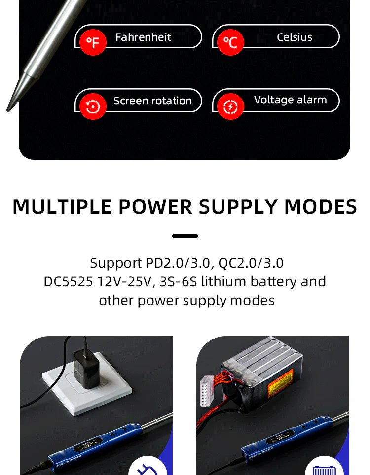 • Maitinimas: palaiko PD3.0, QC2.0, DC 12 V–25 V maitinimo šaltinius bei 3S–6S akumuliatorius.